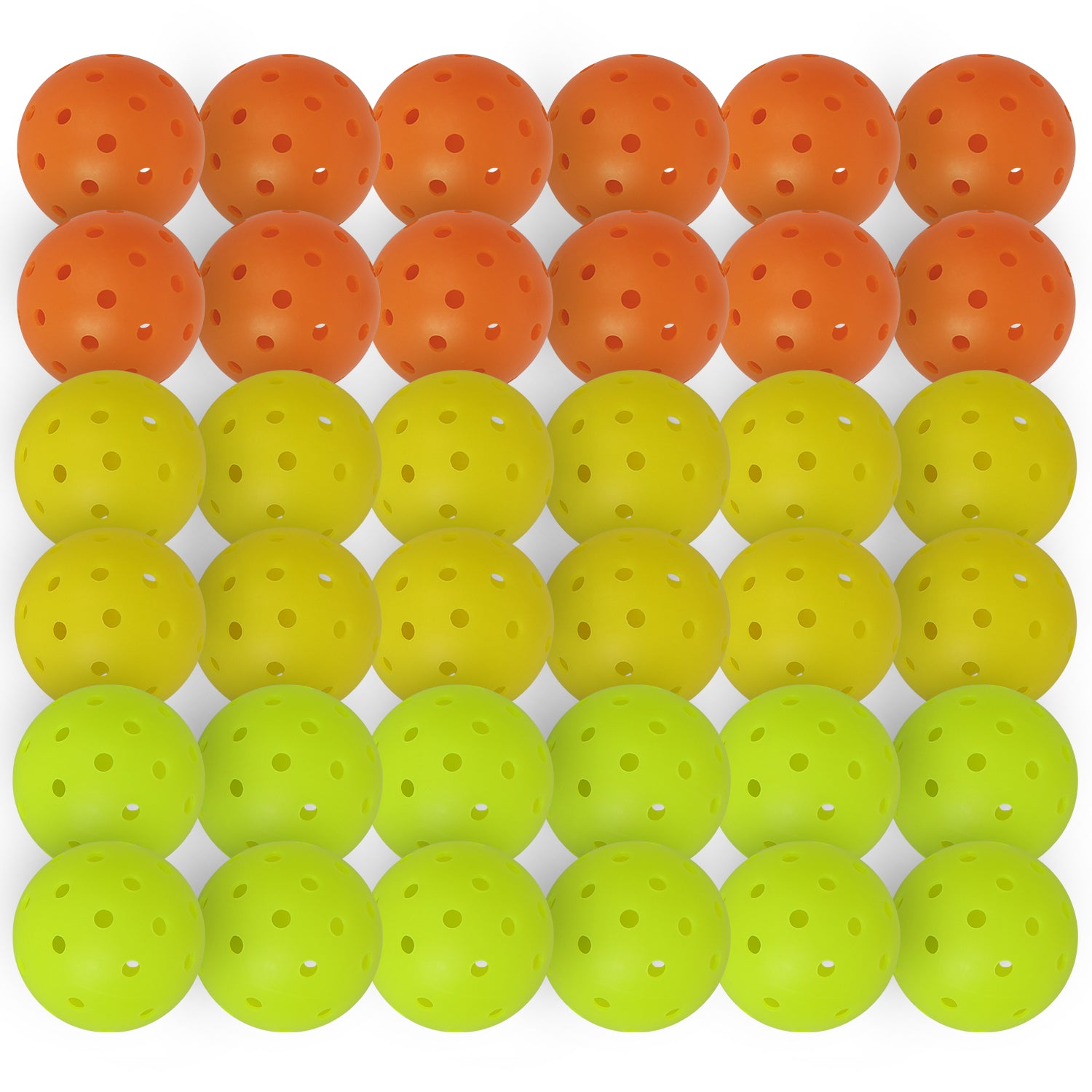 Ideal for all players, these x40 pickleball balls outdoor x 36 PCS a seamless one-piece design that ensures they are quiet and efficient, with 40 holes for optimal air flow, a size of 2.95 inches/75mm, and a weight of 26g, delivering unmatched accuracy, control, high bounce, speed, spin, precision, and stability in both outdoor and indoor settings, making every game enjoyable and competitive.