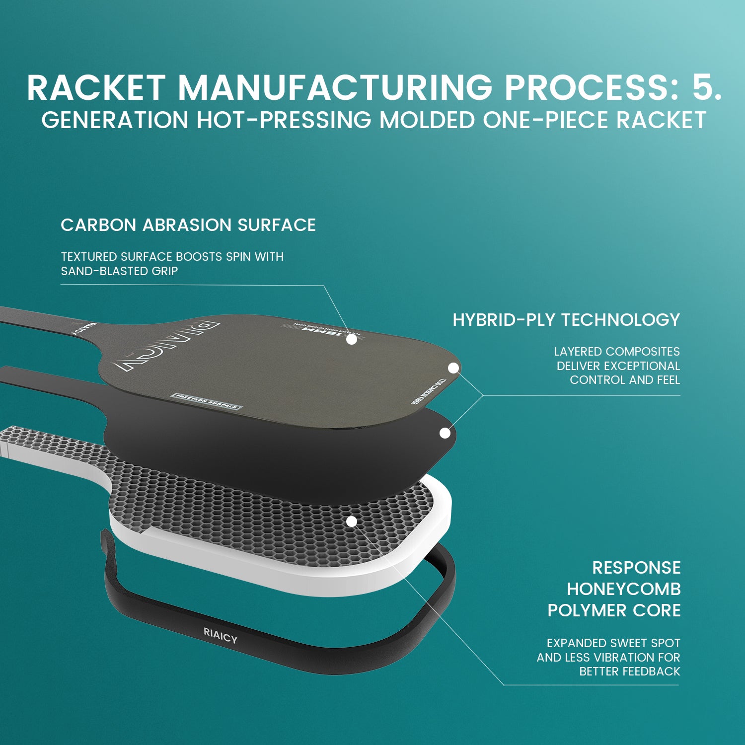 RIAICY tech flex power this design integrates materials, construction and design to produce optimal weight distribution that enhances black pickleball rackets flexibility without sacrificing structure. This design combines superior power with an increased sweet spot and higher forgiveness to manage mishits, allowing every player to hit with precision and maintain control of their shot